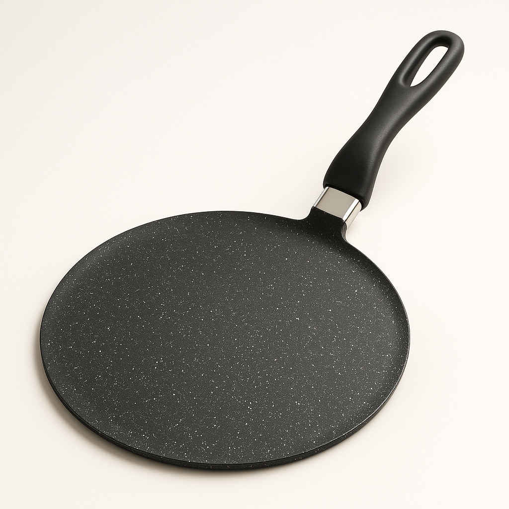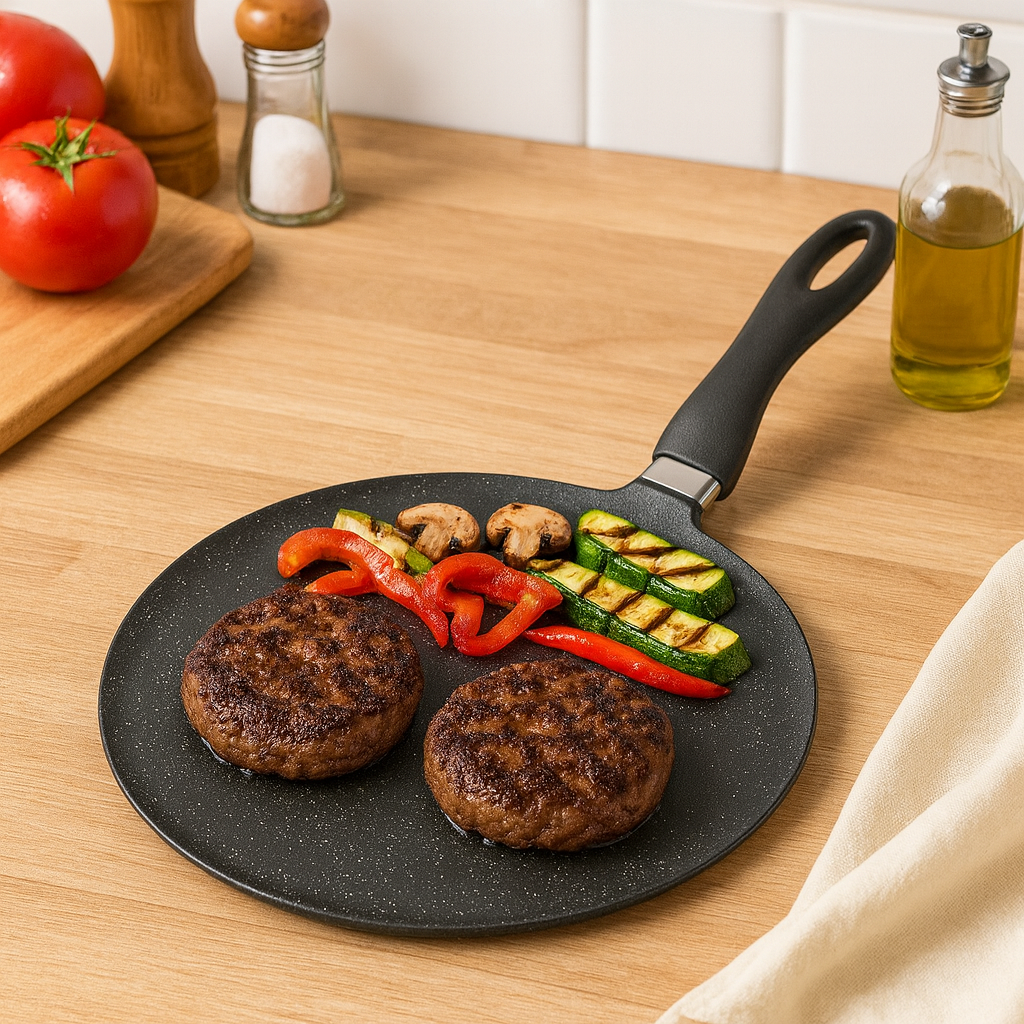 Crepes sottili, piadine croccanti, uova e frittate perfette: con la nostra crepiera/piadarola in pietra lavica porti a tavola la vera cucina di casa. La superficie ampia e uniforme ti permette di girare e farcire con facilità, mentre il rivestimento a 4 strati in pietra lavica ti fa cucinare in modo naturale, anche senza olio né burro, per piatti più leggeri ma pieni di gusto.