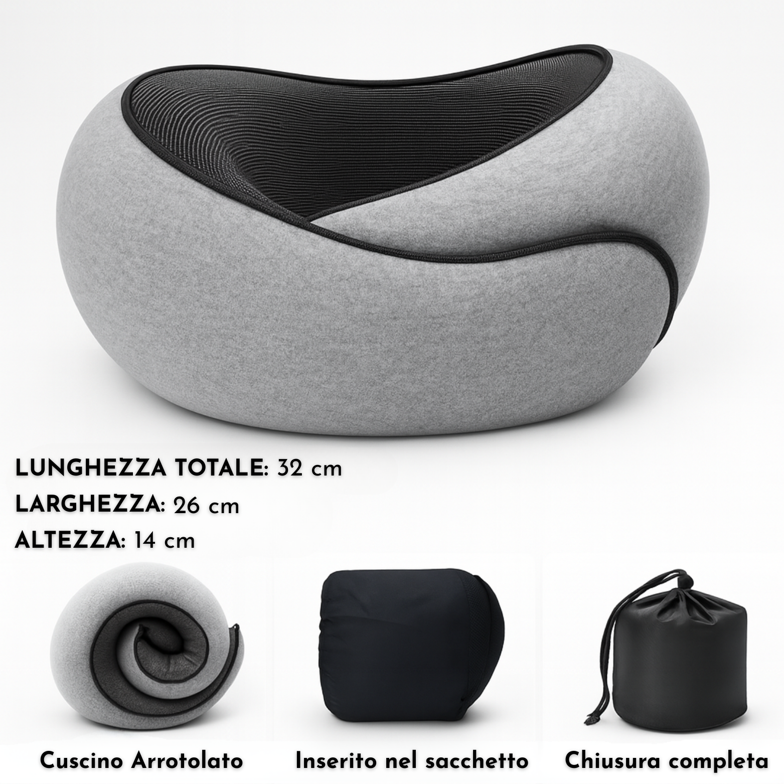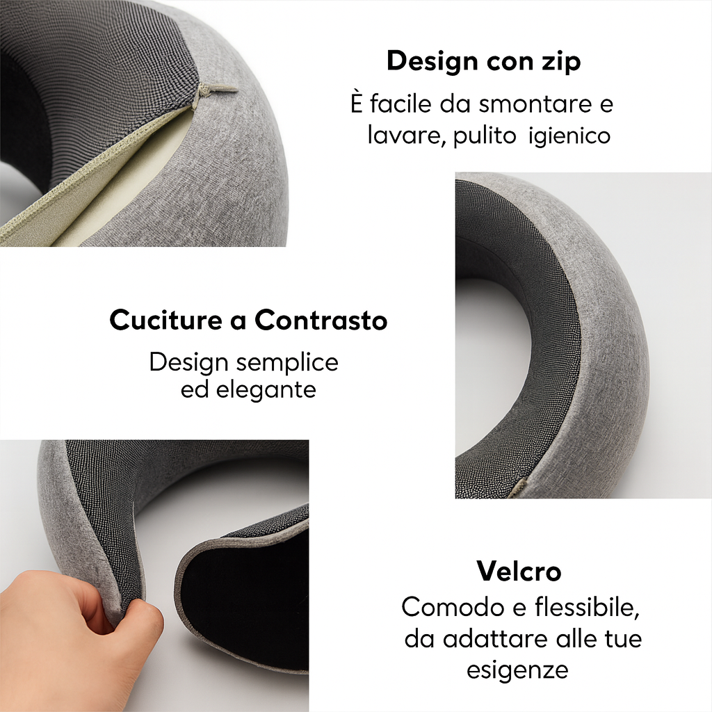 Il compagno perfetto per viaggi, riposini in auto, voli lunghi o pause relax: ti sostiene la testa, il collo e ti abbraccia dolcemente ovunque sei.